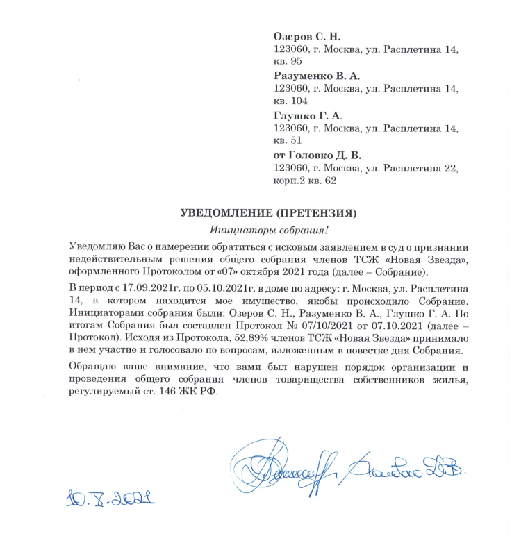 Претензия к инициаторам общего собрания членов ТСЖ (Протокол от 07.10.2021г N 07/10/21) от кв.31 Головко Д.
